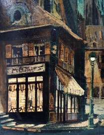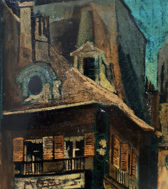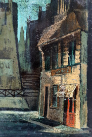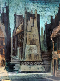Maestro scenografo della seconda metà del Novecento, bozzetto di una scena teatrale per La Boheme di Giacomo Puccini, tecnica mista su cartone, cm 36x50