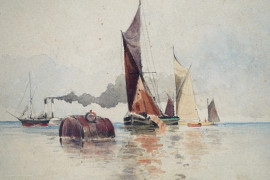 Marina con barche, XIX secolo, acquerello su carta, siglato in basso a destra, misure comprese passepartout cm 24,5x29, entro cornice
