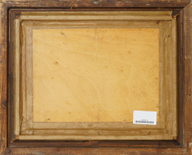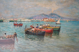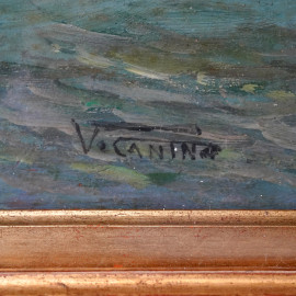 Marina con imbarcazioni, olio su compensato, cm 25x34, firmato in basso a sinistra, entro cornice