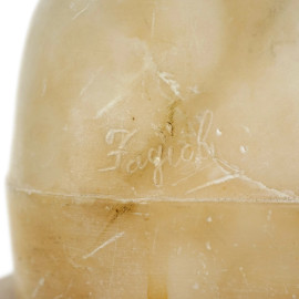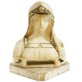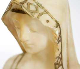 Mater Purissima, marmo bianco con rifiniture dipinte dorate, cm 26,5x17,5x17,5, firmato sul retro, XX secolo, (difetti)