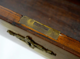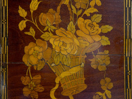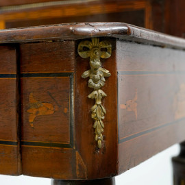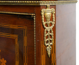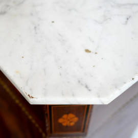 Mobile scrittoio in legno intarsiato in varie essenze, con piano in marmo a un cassetto e corpo superiore a doppia anta, inserti bronzei, XIX secolo, cm 138,5x74x50, (difetti)