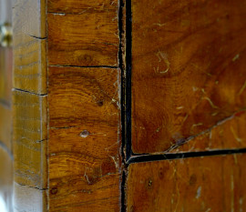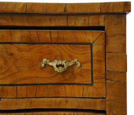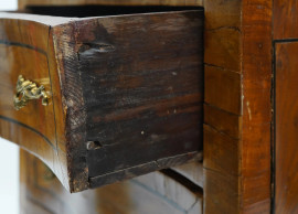 Mobiletto in legno impiallacciato con fronte e gambe mosse, due cassetti con maniglie bronzee dorate, XX secolo, cm 76x57x34 (difetti e rotture)