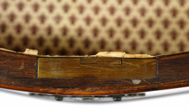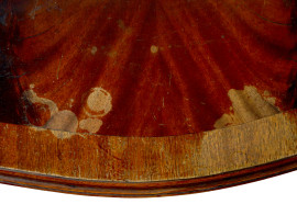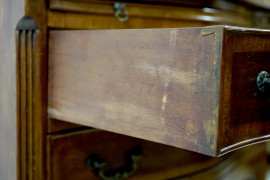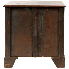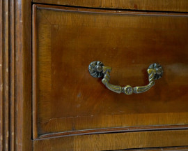 Mobiletto in mogano con profilo mosso scandito da quattro cassetti con maniglie bronzee, XX secolo, cm 77,5x70x49 (difetti)