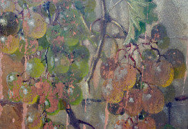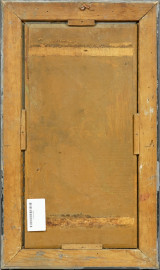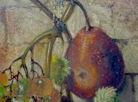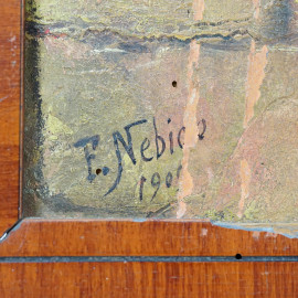 Natura morta con pera e uva, olio su tavoletta, cm 19,50x40, firmato e datato "F. Nebic 1901" in alto a sinistra, entro cornice
