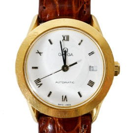 Orologio da donna Omega con cassa in oro e cinturino in pelle, quadrante circolare 25 mm, BA5660285, lunghezza cm 21, (difetti, meccanismo da revisionare)