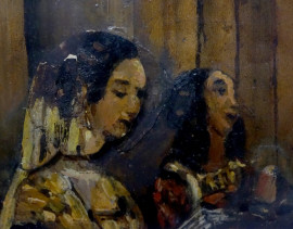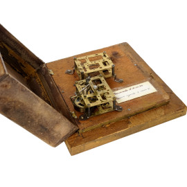 Orologio da muro automa con decoro raffigurante due figure femminili in preghiera, piccolo quadrante circolare, XX secolo, cm 27x25x10,5 (difetti e meccanismo da revisionare)