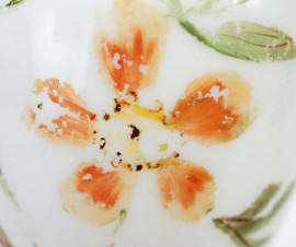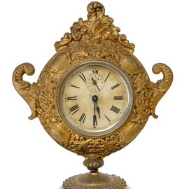 Orologio da tavolo con corpo in opalina decorato a motivi floreali, quadrante circolare e base in metallo dorato, XX secolo, altezza cm 53