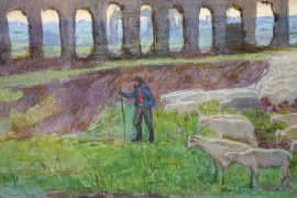 Paesaggio con acquedotto, XIX secolo, acquerello su carta, cm 32x50, entro cornice, (difetti)