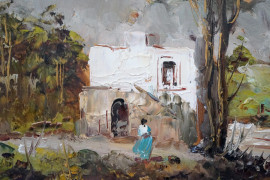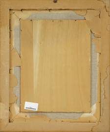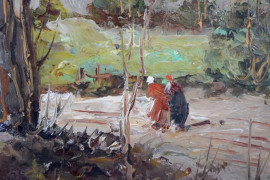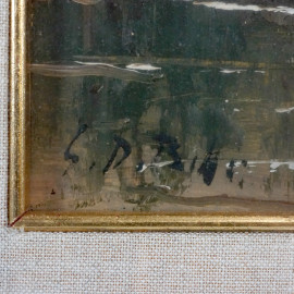 Paesaggio con figure, XIX secolo, olio su compensato, firmato in basso a sinistra, entro cornice