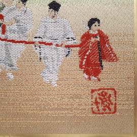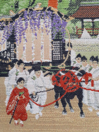 Pannello vintage in seta cinese raffigurante cerimonia con carro, cm 27x24