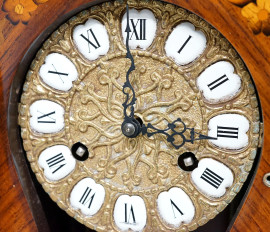 Pendola con mensola in stile Luigi XV, decori floreali e finiture in bronzo dorato, misure orologio cm 46x21,5x12, misura mensola cm 25,5x29x19 (difetti e meccanismo da revisionare)