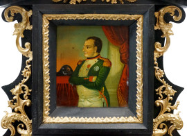 Pendola da camino a tempietto in legno ebanizzato con colonne in alabastro e finiture in bronzo dorato, parte superiore con decoro raffigurante il ritratto di Napoleone, XIX secolo, cm 61,5x36x14, entro teca in vetro e legno, cm 73,5x44x23 (difetti e meccanismo da revisionare)