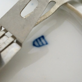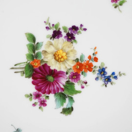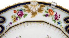 Piatto tondo in porcellana decorata a mano in policromia a motivi floreali e nastri nei toni dell'oro e del blu, Austria, XX secolo, diametro cm 25,5, (difetti)