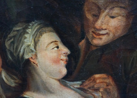 Pittore olandese del XVIII-XIX secolo, Scena galante, olio su tela, cm 29x25,5, entro cornice
