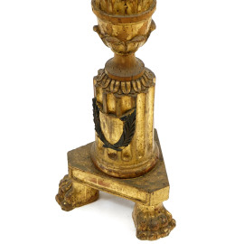 Portacero in legno scolpito e dorato, fusto scanalato con decori a foglie, poggiante su tre piedi ferini, XIX secolo, altezza 138,5 (difetti)