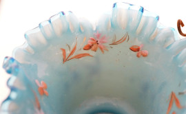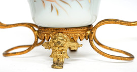 Portafiori con struttura in metallo dorato a fogliami ed arabeschi, sostenente un piatto centrale e due tulipani laterali in opalina blu decorati a motivi floreali, XIX-XX secolo, cm 26x31, (difetti)