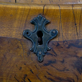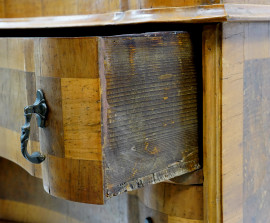 Ribaltina in noce, faggio e radica, con fronte mosso a tre cassettoni e sportello a ribalta contenente due cassetti e due vani, maniglia a racemi bronzei, XX secolo, cm 94x64x38 (difetti)