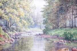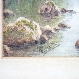 Ruscello nel bosco, XX secolo, acquerello su carta applicata su cartone, cm 34x21, firmato "O. Carlandi" in basso, (difetti)