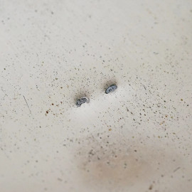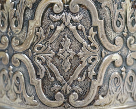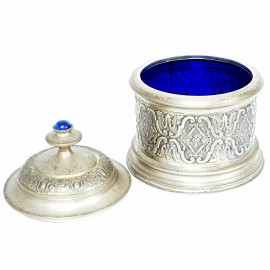 Scatola circolare in argento con corpo sbalzato e cesellato a motivi vegetali e volute, presa del coperchio con terminale in lapislazzulo cabochon, interno in vetro opalino blu, peso lordo gr 1010, (difetti)