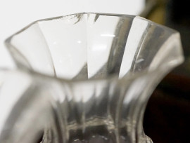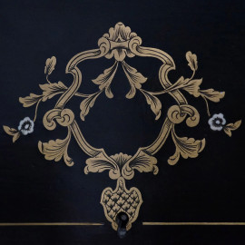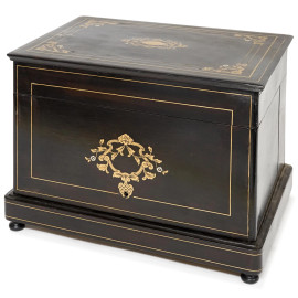 Scatola porta liquori in legno ebanizzato con decori dorati, contenente 12 bicchierini e 4 bottiglie in cristallo, dimensioni scatola cm 25x23x32,5 (difetti)
