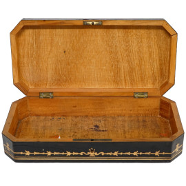 Scatola sorrentina in legno intarsiato a motivi vegetali e animali, XX secolo, cm 6x27x13 (difetti)