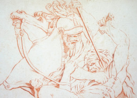 Scena di battaglia, sanguigna su carta, XIX-XX secolo, cm 40x30 compreso passepartout, entro cornice, (difetti)