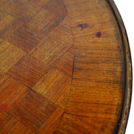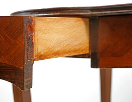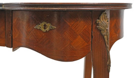 Scrittoio a fagiolo in Satinwood, a tre cassetti, angoli e piedini anteriori con inserti fogliacei bronzei, XX secolo, cm 76x113x50, (difetti)
