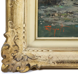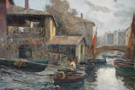 Scorcio con barche, sec. XIX-XX, olio su tela, cm 50x70, firmato, entro cornice