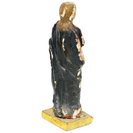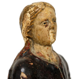 Scultura in legno policromo con occhi in vetro raffigurante una santa, XVIII-XIX secolo, altezza cm 38 (difetti e mancanze)