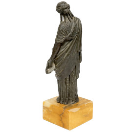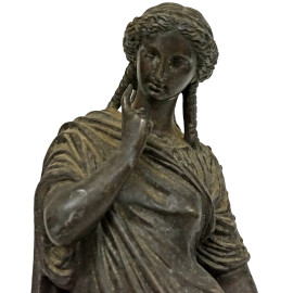 Scultura in metallo brunito rappresentante la musa Melpomene, base quadrangolare in marmo, XX secolo, altezza cm 34