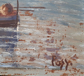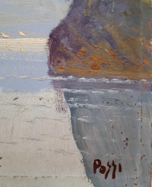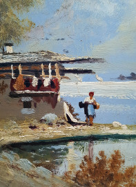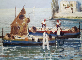 Scuola Napoletana del Novecento, lotto composto da due dipinti ad olio su faesite raffiguranti Veduta costiera con barche e pescatori e Veduta lacustre, ciascuno cm 30x40, firmati