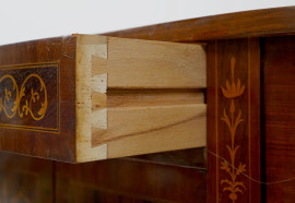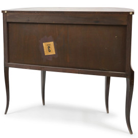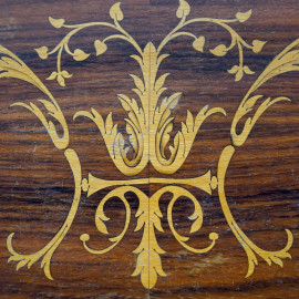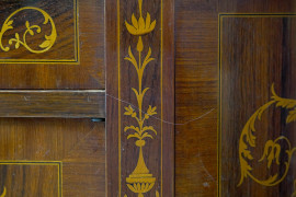 Servantina in legno impiallacciato con decori intarsiati in varie essenze, 2 sportelli e un cassetto, XX secolo, cm 87,5x100,5x29,5 (difetti)
