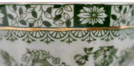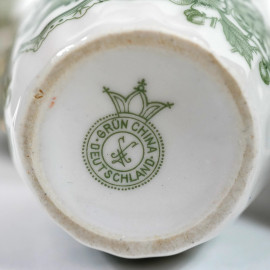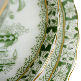 Servizio da the in ceramica decorata a motivi floreali nei toni del bianco del verde e rifiniture dorate, XX secolo, composto da: 9 tazze, 12 piattini, 12 piatti, una lattiera e una zuccheriera