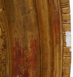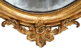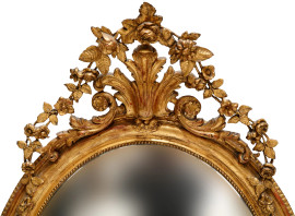 Specchiera ovale in legno dorato e riccamente intagliato nella parte inferiore e superiore a volute vegetali e fiori, XIX secolo, cm 134x87, (difetti)