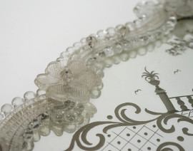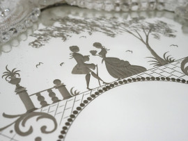 Specchio polilobato decorato a graffio con arabeschi e scena galante, con cornice in vetro di murano a motivi floreali, metà XX secolo, cm 52x43,5, (difetti)