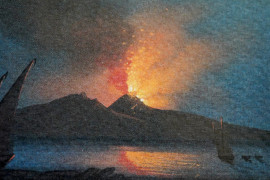Stampa raffigurante l'eruzione del Vesuvio, XX secolo, misure comprese passepartout cm 12x17, entro cornice