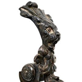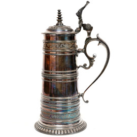 Tankard in Sheffield cesellato, con ansa a voluta sormontata da testa leonina e interno dorato, XX secolo, altezza cm 39