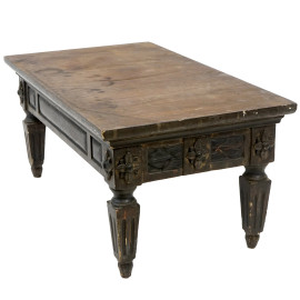 Tavolinetto con segni di doratura a mecca, intagliato a motivi vegetali e gambe a scanalate a piramide rovesciata, XVIII secolo, cm 33,5x73x42, (difetti)