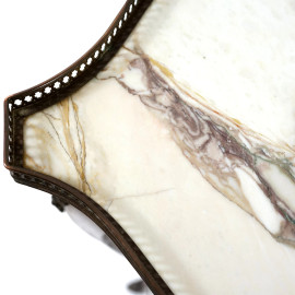 Tavolinetto in Bois de Rose intarsiato a motivi geometrici e floreali, con inserti in bronzo e piano in marmo screziato dal perimetro bronzeo a traforo, cm 69x41x41, (difetti)