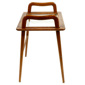 Tavolinetto in stile Giò Ponti in noce con piano rettangolare rimovibile in noce e vetro, XX secolo, cm 54,5x55x34,5, (difetti)