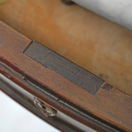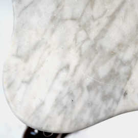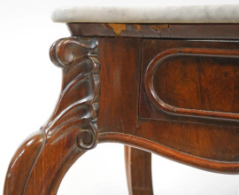 Tavolo consolle Luigi Filippo in legno intagliato, 4 gambe mosse raccordate alla base da una crociera, un cassetto, piano mistilineo in marmo grigio, XIX secolo, cm 79,5x97x52