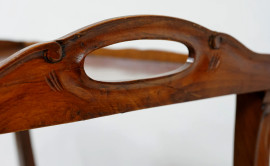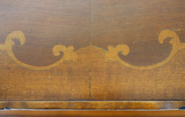 Tavolo portavivande in noce intarsiato in varie essenze, con doppio piano rettangolare e gambe mosse dotate di rotelle, XX secolo, cm 72x40,5x69, (difetti)