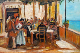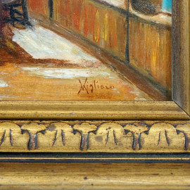Terrazza con figure, XIX secolo, olio su cartone, cm 26x25, firmato, entro cornice, (difetti)