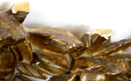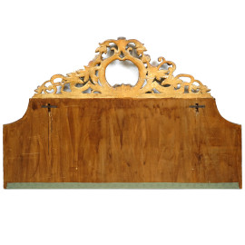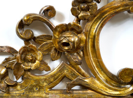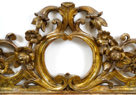 Testiera in legno dorato e intagliato a motivi vegetali e floreali, con imbottitura rivestita in tessuto verde, XIX secolo. cm 122x183, (difetti)