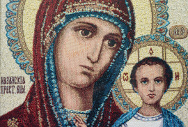 Tesuto ricamato raffigurante Madonna con Bambino, XX secolo, cm 31,5x23, entro cornice