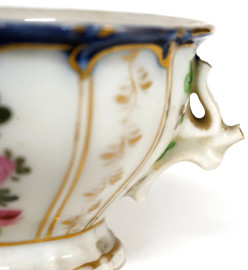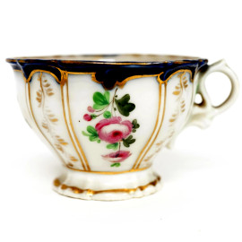 Tre tazze da tè in porcellana policroma con decori floreali e finiture dorate, XX secolo (difetti e rotture)
