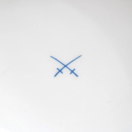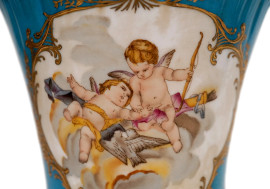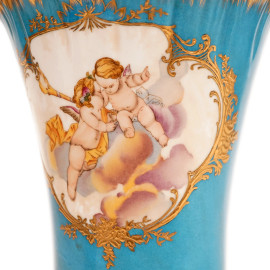 Vaso in porcellana Meissen nei toni dell'azzurro e dell'oro con scene di putti, XX secolo, altezza cm 24,5