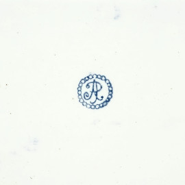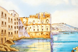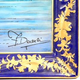 Vassoio in porcellana dipinta con marina e Vesuvio sullo sfondo entro cornice blu a festoni dorati, firmato F. Decerchi, XX secolo, cm 29x45, sul retro "AR"