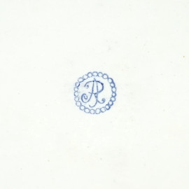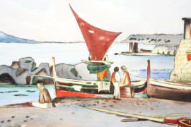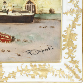 Vassoio in porcellana dipinta con scena di figure sulla spiaggia e entro cornice bianca a festori dorati, firmato R. Depretis, XX secolo, cm 29x45
