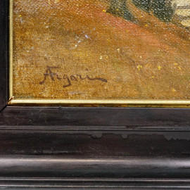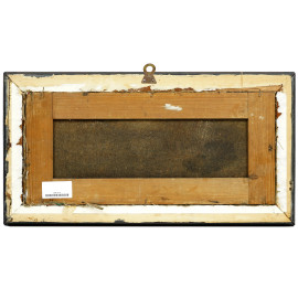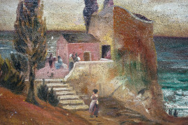 Veduta costiera con chiesa e figure, olio su tela, firmato, cm 21x48, entro cornice